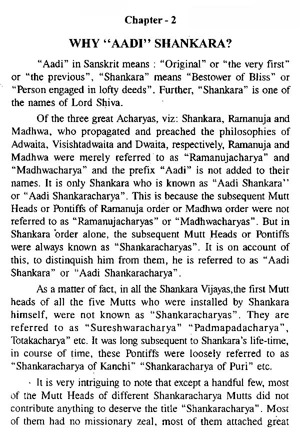 This work is a commendable effort to describe the infinite in finite terms. M.N. Krishnamani has combined his analytical mind of a lawyer with the spiritualism of a true believer, shorn of ritualism as a pragmatic rationalist to expound the true perception of the philosophy of 'Aadi Shankara'. True religion is not in rituals and dogmas but in the belief and practice of virtues, which enrich the human existence. Shankara epitomized the true purpose of human existence and this he achieved in an unusually short span of life. The author, in this work does not merely extol the virtues but also the idealistic realism of the practice of true religion. The book depicts the philosophy of Shankara as the precursor of secularism in the Indian ethos and a powerful message of national integration.