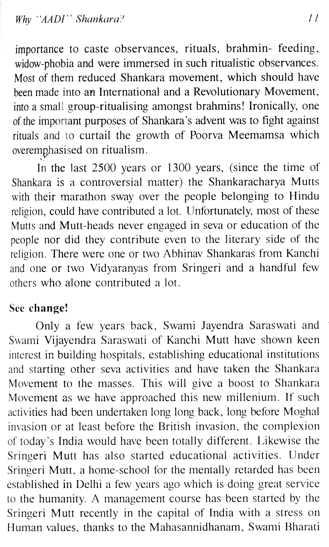 Krishnam to appreciation heri Vern Shri Krishnamani is busy lawyer and devout Hindu, who has knowledge our scriptures. He has authored book on Adi Shankara's "Bhaja Govindam". This 'Shankara, Revolutionary another There be Indian does know Shankara. Shri Krishnamani has presented Shankara in this book with commendable arrangement thought analytical presentation. has brought out the thoughts and Shankara drawing parallel from and religious personalities in Indian Culture. He focussed attention. on Hinduism such way demonstrate how Hinduism absorbed even major religions. In context his skillful reference Bhavishya Purana Chapter 17 manifests of interpretation. is a coincidence that occurs in XIV where writes under the head 'Debate with Mandana Mishra'. has exihibited his own debate as lawyer. He has bestowed some thought and animadverted to alleged anecdote of Shankara's 'Parakaya Pravesam'. add one more reason to the reasons already given by Krishnamani in support his view. For be knowing necessary that he himself should have experienced it physically. The perception great men not necessarily based on physical experience. Their knowledge acquired same methodology of acquisition knowledge by ordinary mortals. am happy Shri Krishnamani courage raise this disputation.