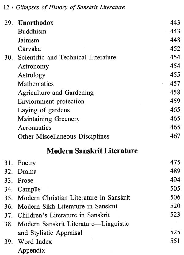 No history of Sanskrit literature covers the modern Sanskrit literature in its various dimensions, the more noteworthy of them being its assessment from the point of view of theme, vocabulary and style, the children's literature and the literature on Christianity and Sikhism. In the treatment of the Vedic literature there is demonstration in written form of the eight types of recitations, called vikrtipathas as also graphic reproduction of some of the Upanisadic dialogues. The Ramayana and the Mahabharata belong to two different aeons, Yugas, the former to Treta and the latter to Dvapara, Yet the similarity both have with each other within all the dissimilarity subsuming them has been brought out in the write-up "Ramayana and Mahabharata- A Study in Comparison." There is a comprehensive write- up on environment which this history of Sanskrit literature alone deals with. So does it with sciences, natural and physical. Readers may have heard of the various citrabandhas, fittings in pictorial form of Sanskrit verses but may not have actually seen any of them. This history will furnish them with instances of several of them from the Kiratarjuniya of Bharavi and the Sisupalavadha of Magha. In the Kadambari of Bana several characters assume different form and name in re-births which could be quite confusing. Their original names and forms together with the changed ones are presented in the present history in the form of a graph for easy appreciation. A verse from the Naisadhiyacarita called Panficanali in scholarly circles which has different connotations for each of the four deities who had assumed the form of King Nala to confuse Damayanti is reproduced with different interpretations meant for each as also the real Nala. The aerial car. Pusapaka, finds a detailed treatment as given in the Valmiki-Ramayana along with references to aerial cars in other later Sanskrit texts together with mention of seven Sanskrit texts, a number of them still in manuscript, on the science of Aeronautics. There is mention in the present work of a peculiar method called Dakargala for testing the soil for availability of adequate sub-soil water for fertility as also the expertise of the ancients for water harvesting, the agricultural science, the art of cooking, the art of laying gardens and a multitude of other disciplines as evidenced by relevant texts. The very introduction of the work seeks to break fresh ground by touching points like Sanskrit ever having been a spoken language, the presence of it in modern Indian languages with proper illustrations, its future in the present, 21" century and the centuries to follow and the ways to connect it with the common man.