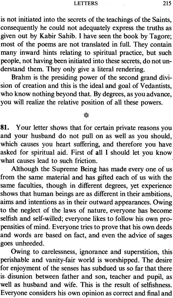 Some letters are very lengthy and contain many different subjects, in reply to the queries raised by the satsangis and seekers in their letters to the Great Master. The long replies were necessary in order to cover all aspects of their queries. Written with compassion and understanding, these letters reflect the Great Master’s deep love for his American disciples, who though physically far away from him were close to his heart. Each letter is punctuated with the Master’s concern for their welfare, his keen desire to explain the finer points of the path to them, to encourage and inspire them to attend to their meditation with loving earnestness.