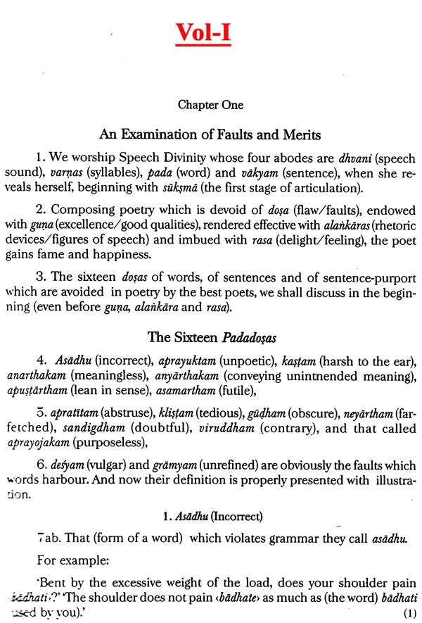 The contents of this work have been summarized lucidly in the Table of Contents in the Kavyamala edition, and in his introduction in the BHU edition by Biswanath Bhattacharya. Chapter I treats of the faults to be avoided and the qualities to be sustained in poetry. The noteworthy feature in this chapter is the development of the idea of dosaguna. All the exceptions noted by earlier writers to what would normally be called faults, have been put under this category and meticulously illustrated. The faults of upama as well as these thwarting rasa have been dealt with in this chapter, the latter not as elaborately as in later works.