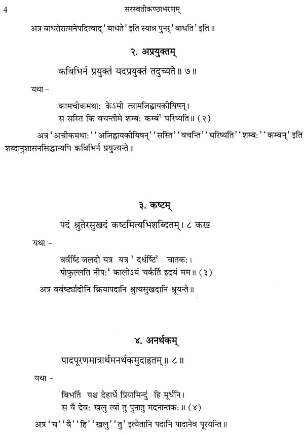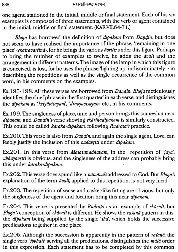 Again, Bhattacharya has divested some of the defining verses which Bhoja had introduced with phrases such as 'yadahuh', of the status of karikas and has put them within apostrophes, without giving them numbers. And in a few places where the borrowing has not been admitted, he has himself supplied phrases such as yadahuh within brackets, and in one instance in Chapter V, without brackets. But as Bhoja had presented many verses from Dandin, and a few from Bhamaha in the form of karikas (we have not followed Bhattacharya in the latter practice). For example, in Chapter I, the APB and KM editions present the verses from Dandin describing desa, kala, agama and their virodha, and the verse on this virodha joining the ranks of merits in exceptional circumstances, all in the form of karikas. Bhattacharya presents the descriptive verses as borrowings and the exempting verse as a karika. The earlier editions have been followed by us in this matter.