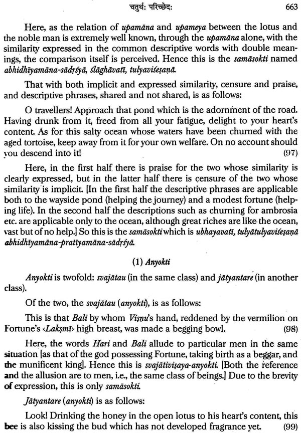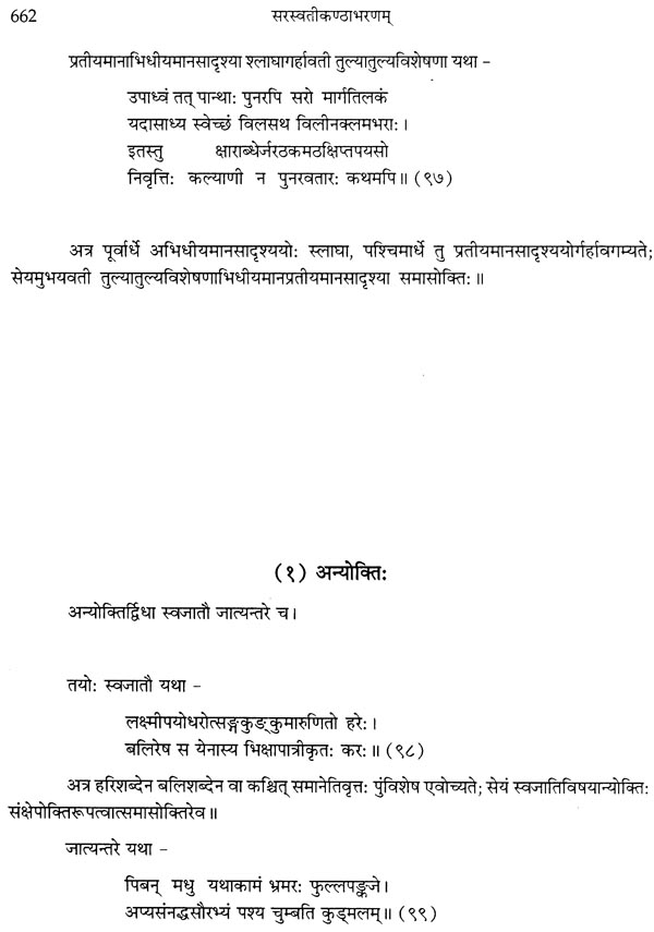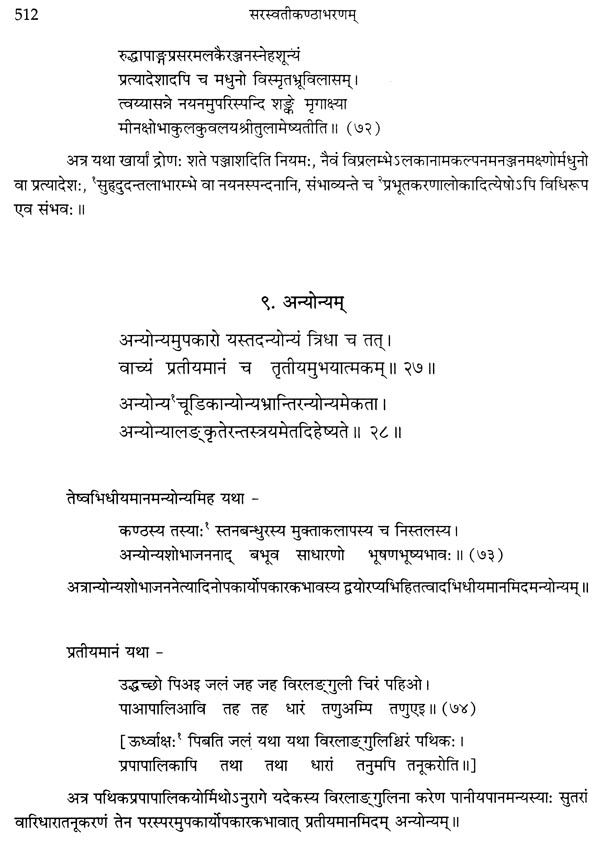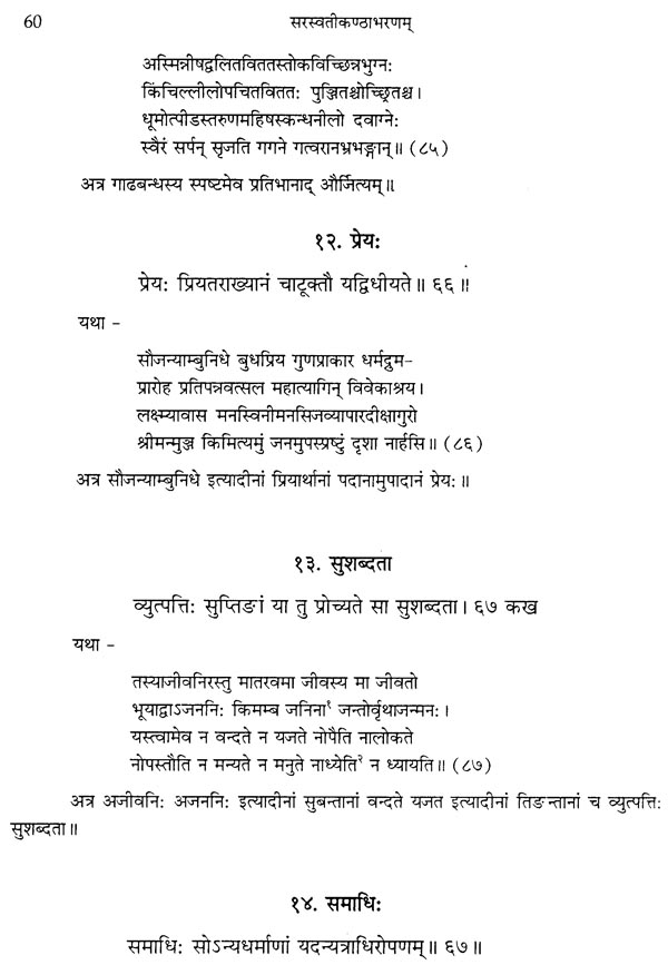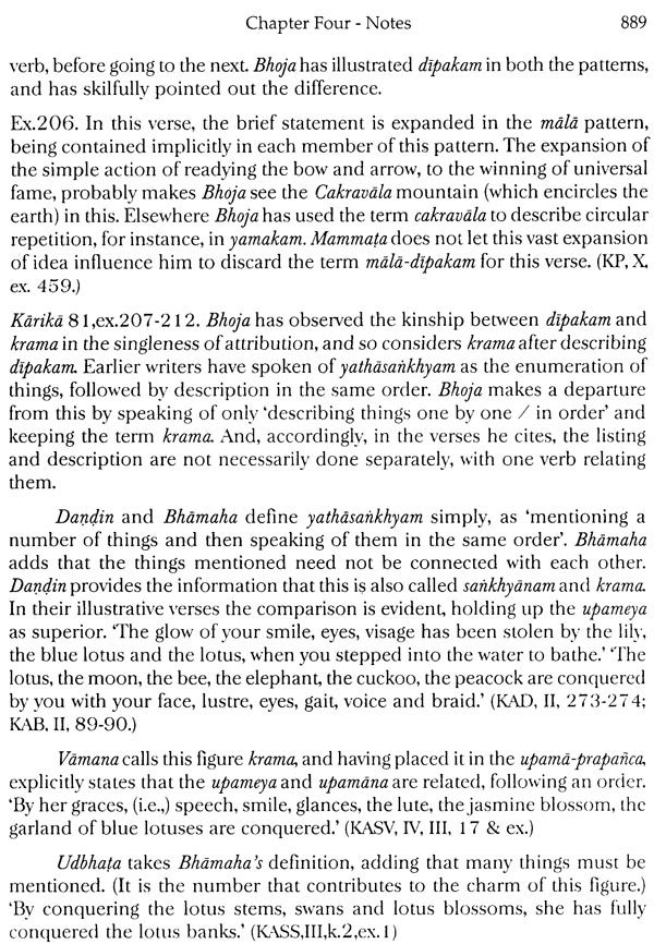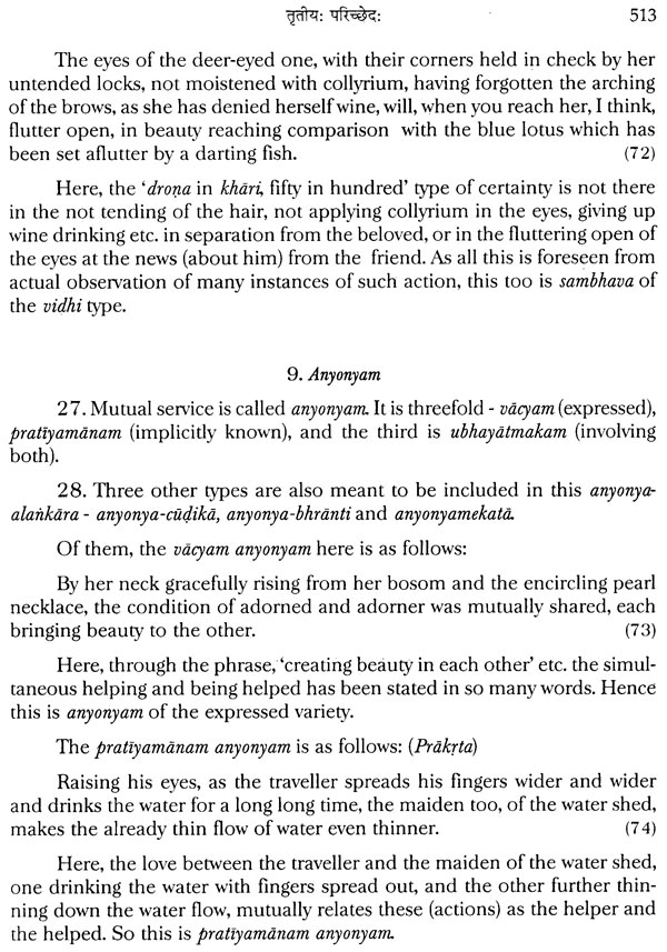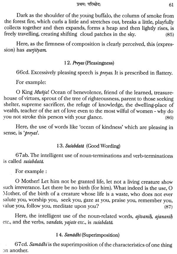 As for the illustrations, often we had to take the assistance of the English translations of the works on Poetics as well as of the kavyas from which they had been selected, so that our translation - out of the context - would not completely misinterpret them and shroud Bhoja's aim in mystery. While this was the dominant purpose in rendering illustrations depicting situations and stories into English, in the case of alankaras, attention was paid to retain the pattern in the expression where possible.