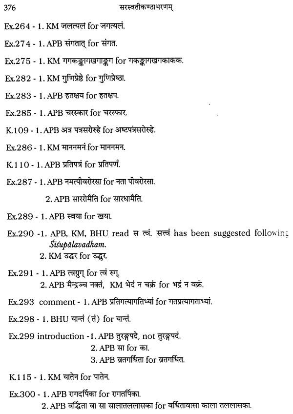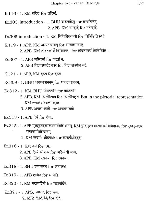 In the present edition, the variant readings have been listed in a separate section after the text and translation. Occasionally variations in reading and more frequently, in punctuation, have not been recorded. The change in the order of words have not been noted if the sense is not affected. In the comment on ex. 36 in Chapter V, the word occurs earlier in the KM edition and has been placed later in the sentence in APB and BHU. Slight changes in the form of a word have been ignored. For instance, in the comment after ex. 38. APB, and BHU read while KM reads. Words which seem to have two accepted forms, e.g. and (V, ex. 40), slight differences as that between and (V, ex. 54 comment), compounded and uncompounded versions like and (introducing V, ex. 40) have not been noted sometimes.