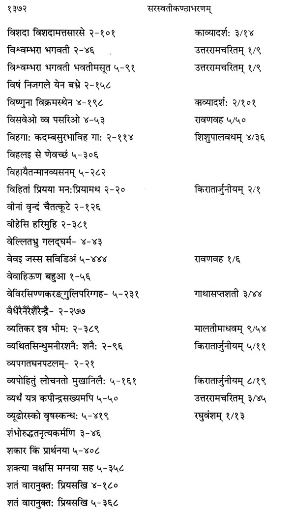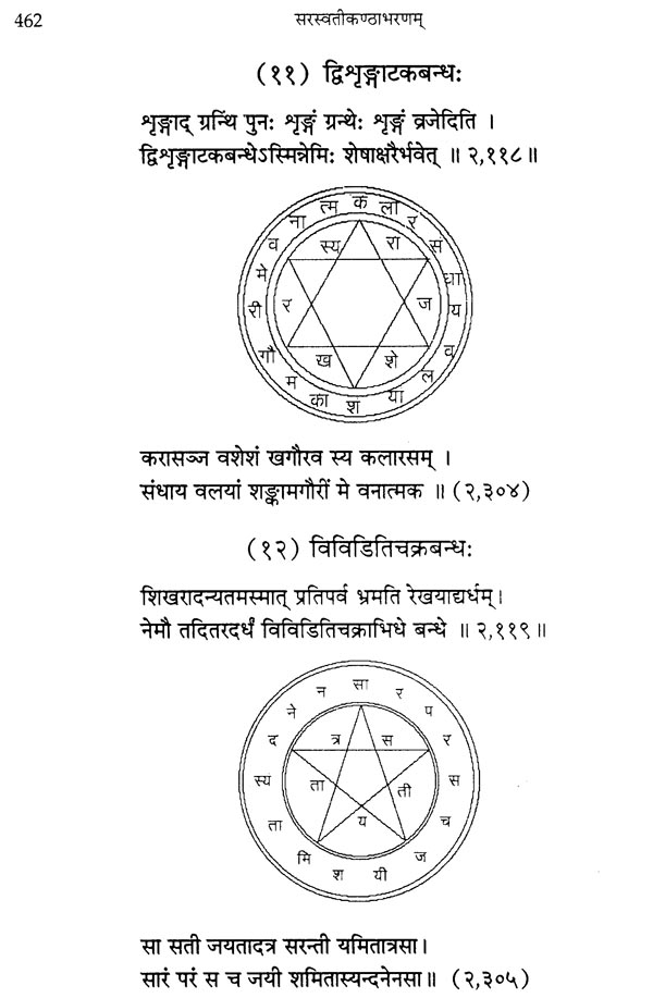 The KM edition includes Ratnesvara's commentary on the first three of the five chapters of the work, and the commentary by Jagaddhara on the fourth. The Introduction furnishes information on the earlier works and authors from whom Bhoja has drawn material, and his political and literary career. At the end of the work, pictorial representation of the different types of citrakavya described by Bhoja has been provided. An alphabetical index (based on Col. Jacob's 'Index to Quotations') of the illustrations along with the sources, has also been appended. This index contains a comparison with the original version.