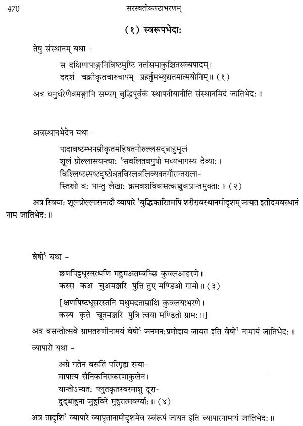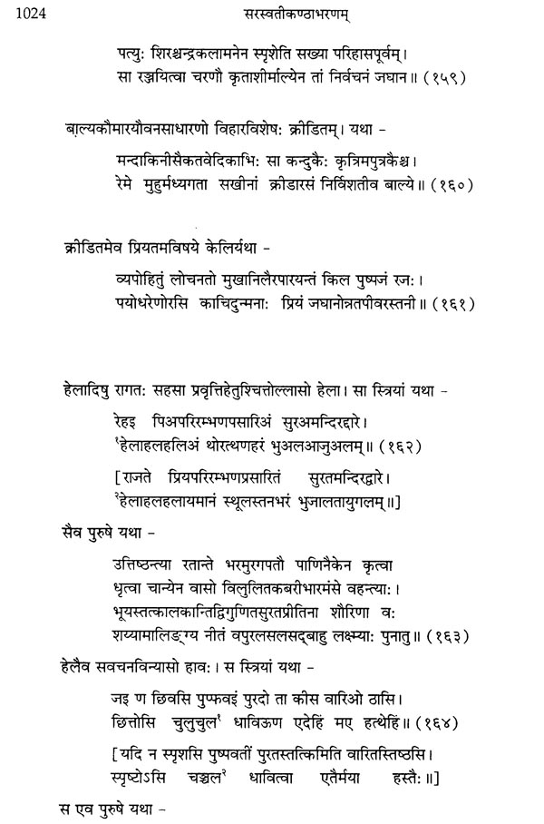 In presenting the illustrations, very rarely, we have changed a reading presented by all the editions consulted, by referring to the original source. Several verses occur more than once in the work to illustrated different ideas, sometimes differing in reading. No unwarranted effort has been made to make the reading uniform. The numbering of illustrations presents another dilemma. Sometimes an illustration is followed by another verse, either to provide the context or in the nature of an explanation. While some of the explanatory verses are from kavya, some are of a general nature. Some have been numbered and some left unnumbered by Bhattacharya. For instance, in Chapter V, after example 74 illustrating Sneha, a verse is cited from Uttararamacaritam. It has not been numbered, as Bhoja had introduced it with 'yadittamahuh'. But an explanatory verse introduced in same manner in Chapter II, in the prose passage following example 76 (78 in the present edition), has been numbered 77. This inconsistency has been removed in the present edition. However, the verses which are not in the nature of a general explanation and have not been introduced with phrases like 'yadahuh', have been numbered.