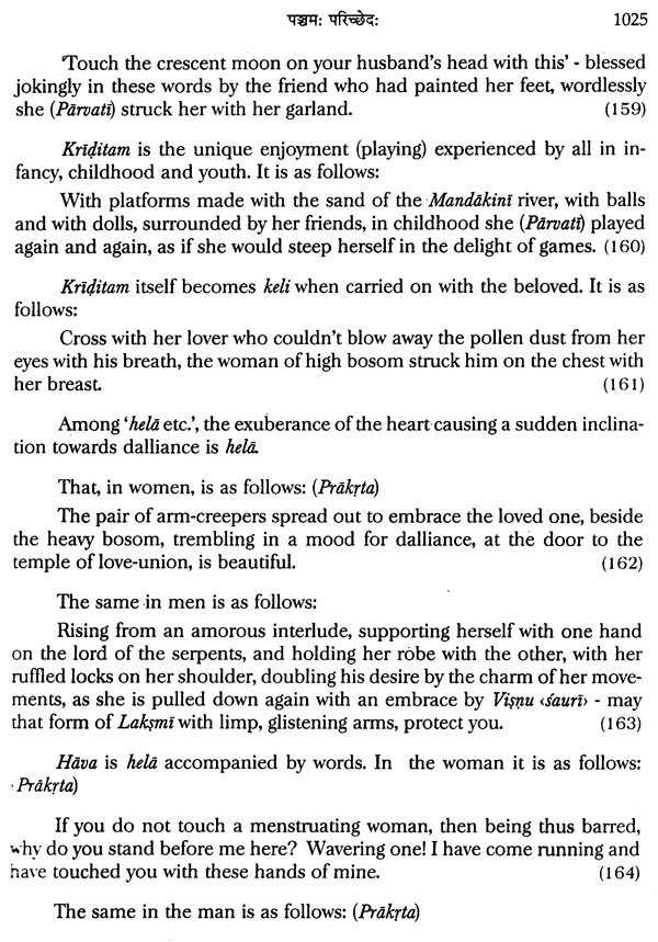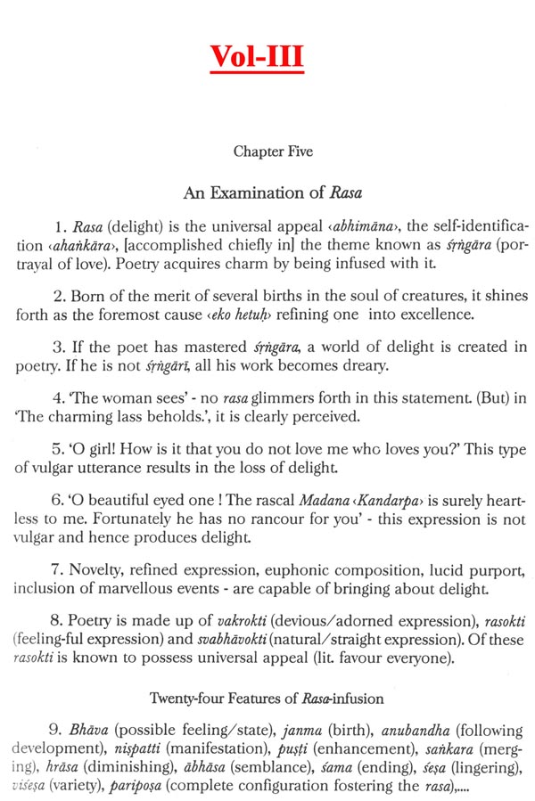 Chapter V deals with rasa or the delectable depiction of emotion in poetry. Bhoja arranges his exposition of rasa in a slightly different scheme. He enumerates and defines all the topics he is going to touch upon under the twenty four heads he divides rasokti into, and then proceeds to supplement these with more detail and illustration. He analyses the various stages in the development of an emotion in poetry, right from its inception to its full development, thwarted by other emotions, merging with others, lingering, completely subsiding and so on. Although all the eight emotions handed down in tradition have been described and another four feelings given the status of rasa, it is the emotion of rati with its variant, priti, that has been accorded prime place and utmost attention. By stratifying the four kinds of vipralambha and the ensuing sambhoga, even through etymological analysis and explanation, Bhoja's conception of srngara has been presented elaborately. And the book concludes with the statement that he has said all that had to be said about Love.